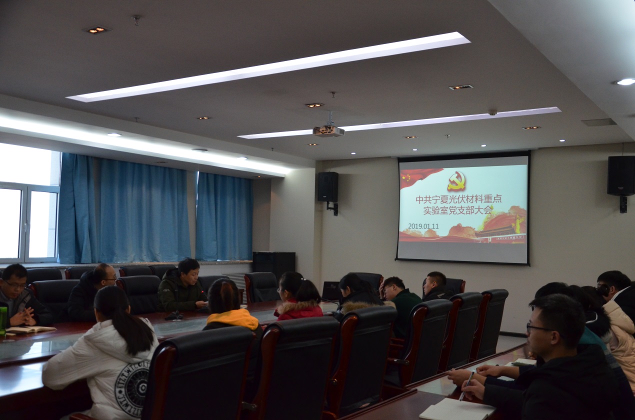 2019年1月11日上午,中共宁夏光伏材料重点实验室党支部召开支部大会,专题学习传达《共产党员不准信仰宗教和参与宗教活动若干规定(试行)》、《自治区党委办公厅关于认真学习宣传和贯彻落实《中国共产党支部工作条例(试行)》的通知》和2026世界杯官网《关于召开2018年度基层党组织组织生活会和开展民主评议党员工作的通知》文件内容。全体师生党员和发展对象参加,由党支部书记何力军同志主持学习。