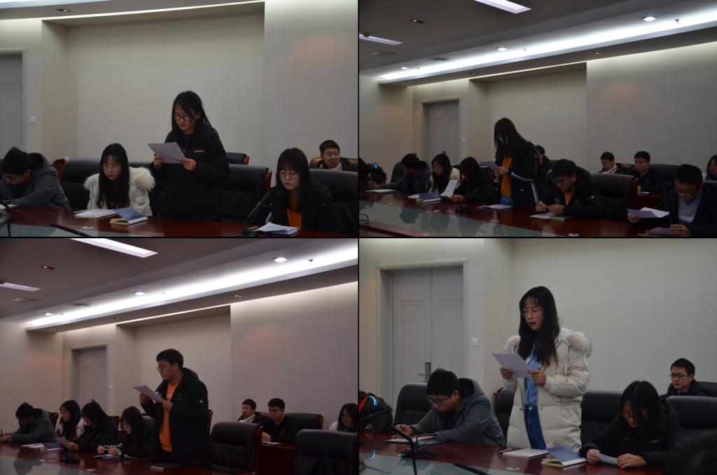 根据大会议程,马明远、王宇欢、黄蓉、李瑞、任基宁五位同志依次宣读入党志愿书,陈述入党动机,汇报学习体会,总结自身的主要优缺点,并说明需向党组织说明的有关问题。支部认为,五位同志已经完成了考察阶段所有培养学习环节,表现好,可以进行吸收为预备党员表决环节。在五位同志回避后,与会全体正式党员依次对他们每个人进行了投票表决。全体党员一致同意接收五位同志为中共预备党员。五位同志重新回到会场后,马薇同志代表支部宣读支委会意见,认为这五位同志各项表现合格,经与会正式党员表决,同意吸收五位同志为中共预备党员。希望预备党员同志能在新的起点上继续努力学习,牢固树立“四个意识”,坚定“四个自信”,做到“两个维护”,完成好学业,为国家强盛、民族复兴作出贡献。大家对新同志加入党组织热烈的祝贺。随后五位同志依次作了表态发言。