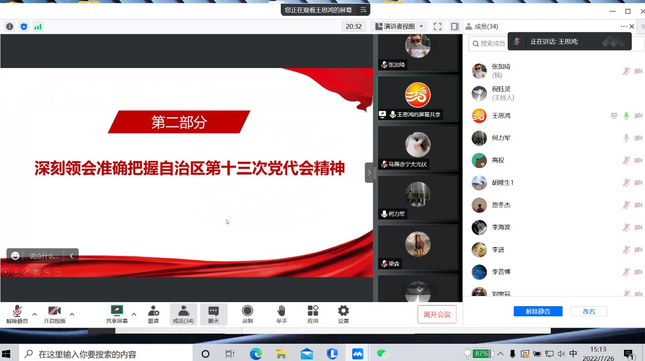 2022年7月26日下午,公司通过腾讯视频会议形式召开《深入学习贯彻自治区第十三次党代会精神》宣讲会,邀请马克思主义公司王思鸿教授主讲。会议由常务副经理何力军同志主持,全体师生参加。