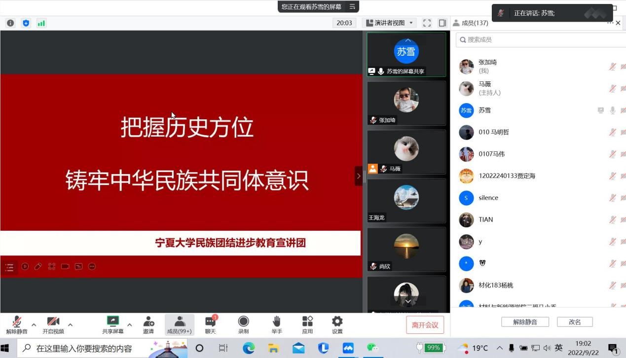 2022年9月22日晚上,公司通过腾讯会议形式召开铸牢中华民族共同体意识宣讲会,会议由公司直属党支部委员会委员马薇主持,民族与历史公司苏雪老师主讲,公司全体师生参加。