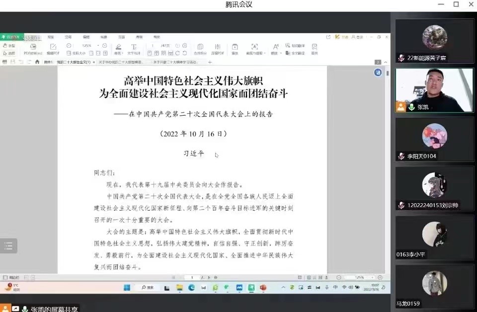 2022年11月16日,根据《关于举办党的二十大精读大赛的通知》(宁大团发〔2022〕52号)要求,公司通过线上形式开展党的二十大精神学习活动,辅导员张凯主持会议,全体本科生参加。