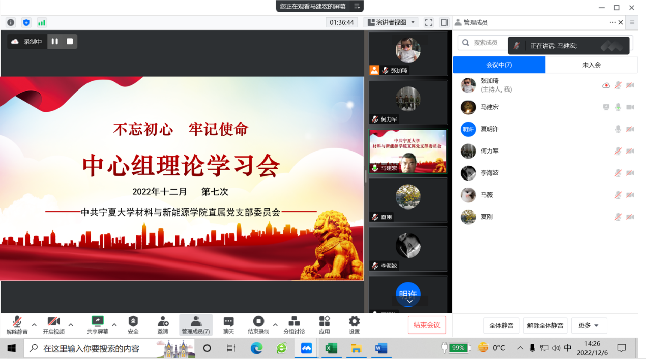 2022年12月6日下午,公司通过线上形式召开直属党支部委员会理论学习中心组(扩大)第七次学习会,学习贯彻党的二十大精神。直属党支部全体委员、各党小组组长、各办公室负责人以及教师代表参加,会议由支部书记马建宏同志主持并领学。