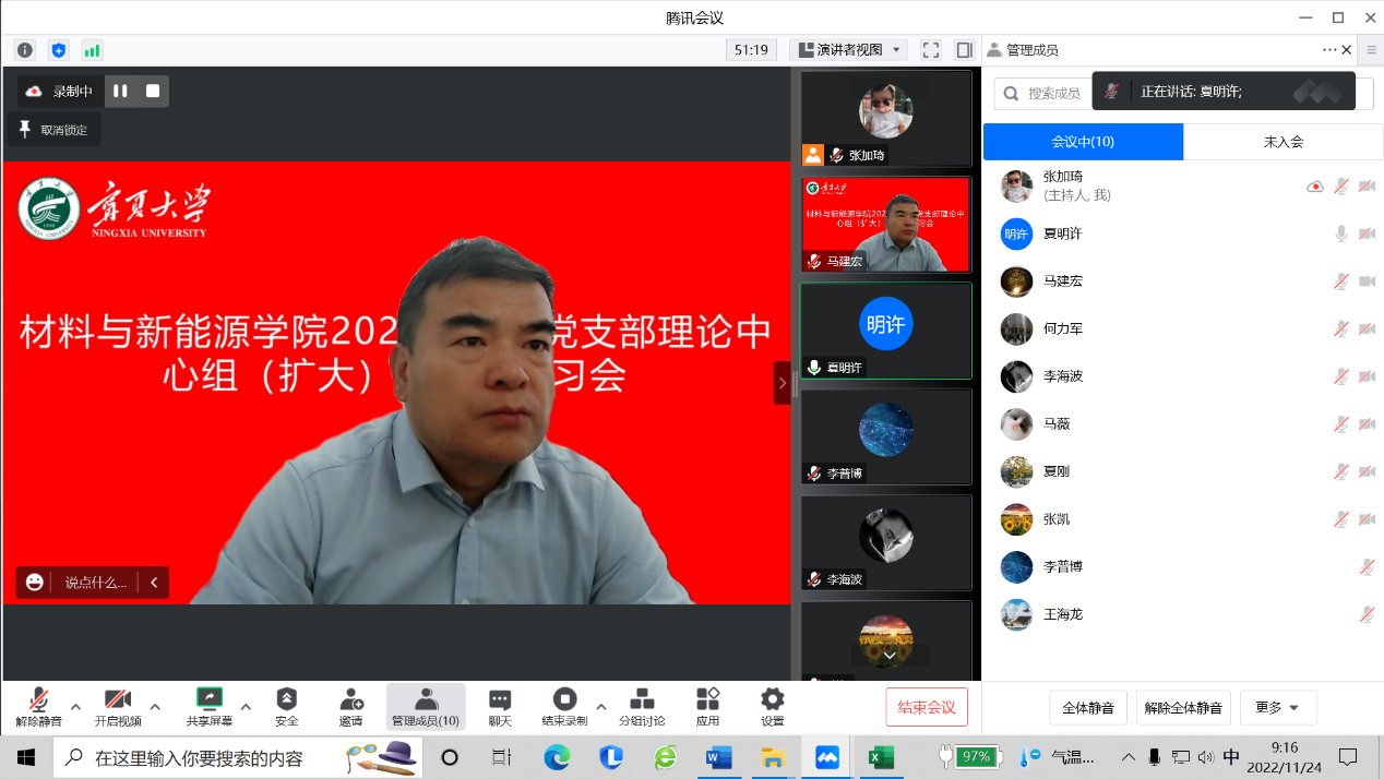 2022年11月24日上午,公司通过线上形式召开2022年直属党支部理论中心组(扩大)第六次学习会,直属党支部书记马建宏主持会议,经理夏明许领学,直属党支部委员、各党小组组长、各办公室负责人参加会议。