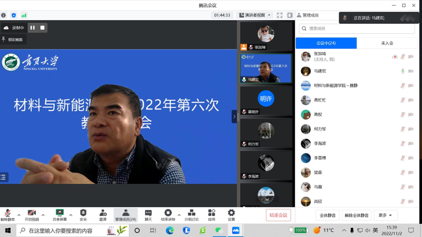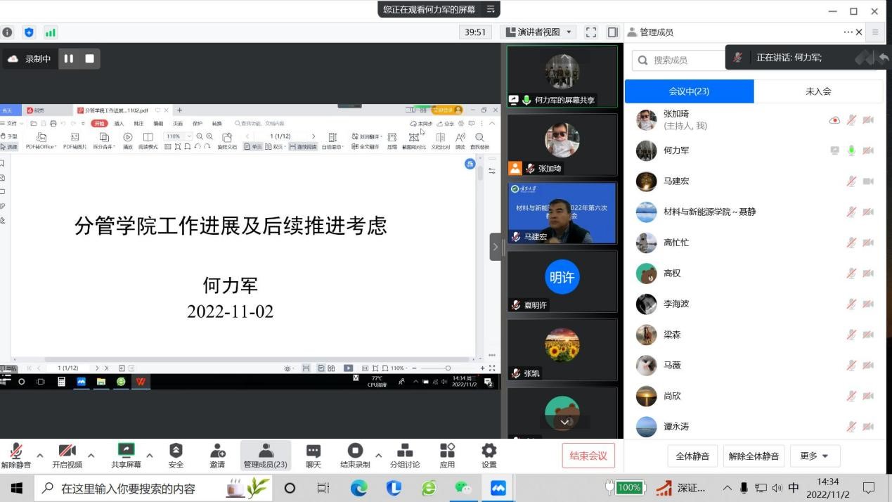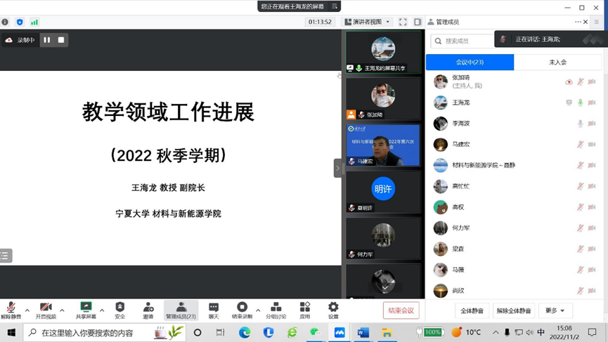 王海龙副经理汇报了组建基层教学组织、材工科培养方案修订、新生入学教育、教学实验室建设等教学领域相关工作情况。