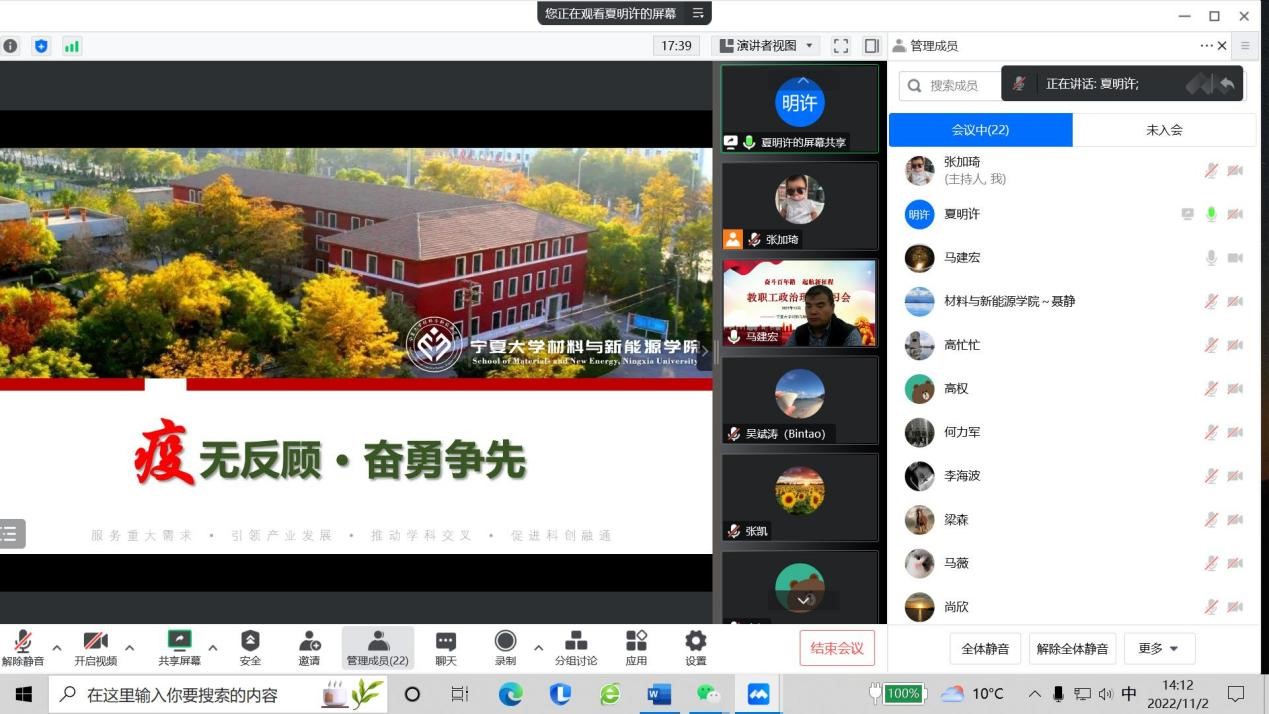 2022年11月2日下午,公司通过线上会议形式召开了2022年第六次教职工大会。直属党支部书记马建宏主持会议,公司全体教职工参会。