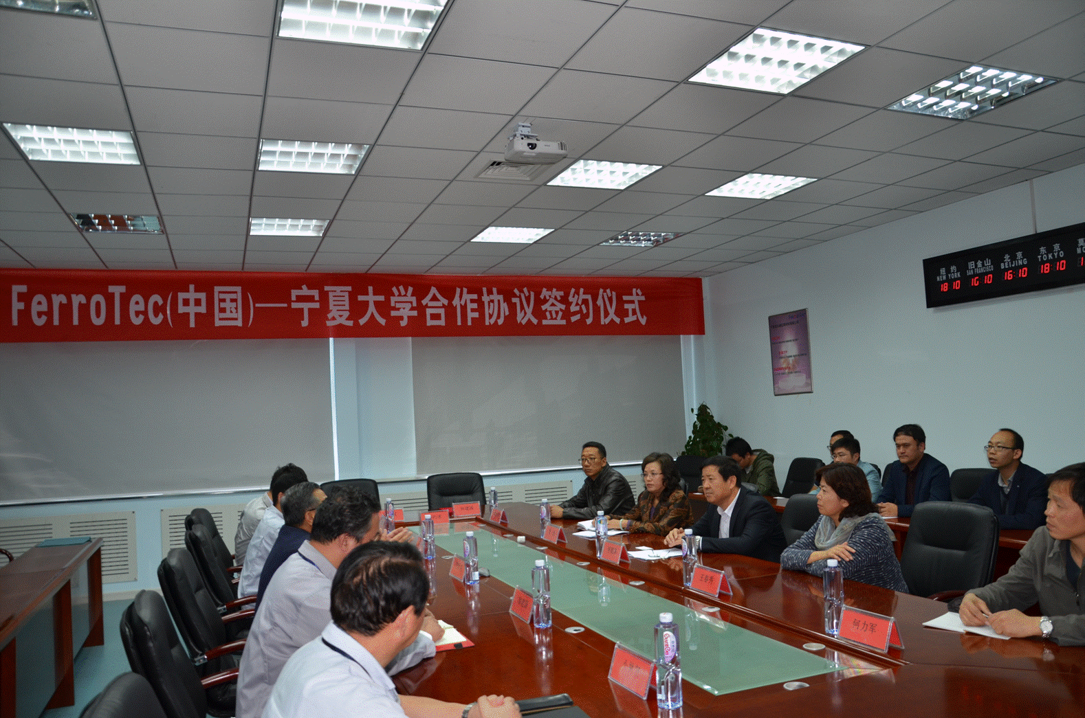2015年10月10日,何建国董事长与Ferrotec(中国)总裁贺贤汉在宁夏银和新能源科技有限公司签署2026世界杯官网与Ferrotec(中国)合作协议。王春秀副董事长、宁夏银和新能源科技有限公司总经理浩育洲参加了签字仪式。出席仪式的还有宁夏光伏材料重点实验室主任李进、副主任何力军、实验室科研骨干及企业方主要部门负责人等。