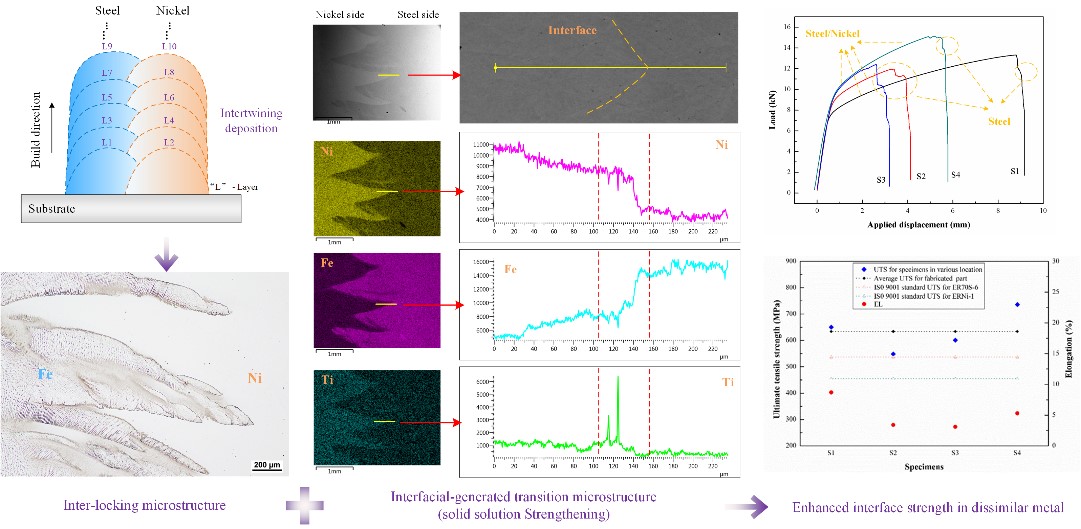 作者运用电弧熔丝增材制造工艺,采用堆积交错的路径模式,成功实现高质量的Fe/Ni异种金属异质结构成形,为电弧熔丝增材制造(金属3D打印)功能性复合材料,梯度材料构件提供新的思路与方案。研究首次实现了高强度Fe/Ni异种金属连接,这一突破有望为传统焊接工艺的提档升级提供新的技术支撑。