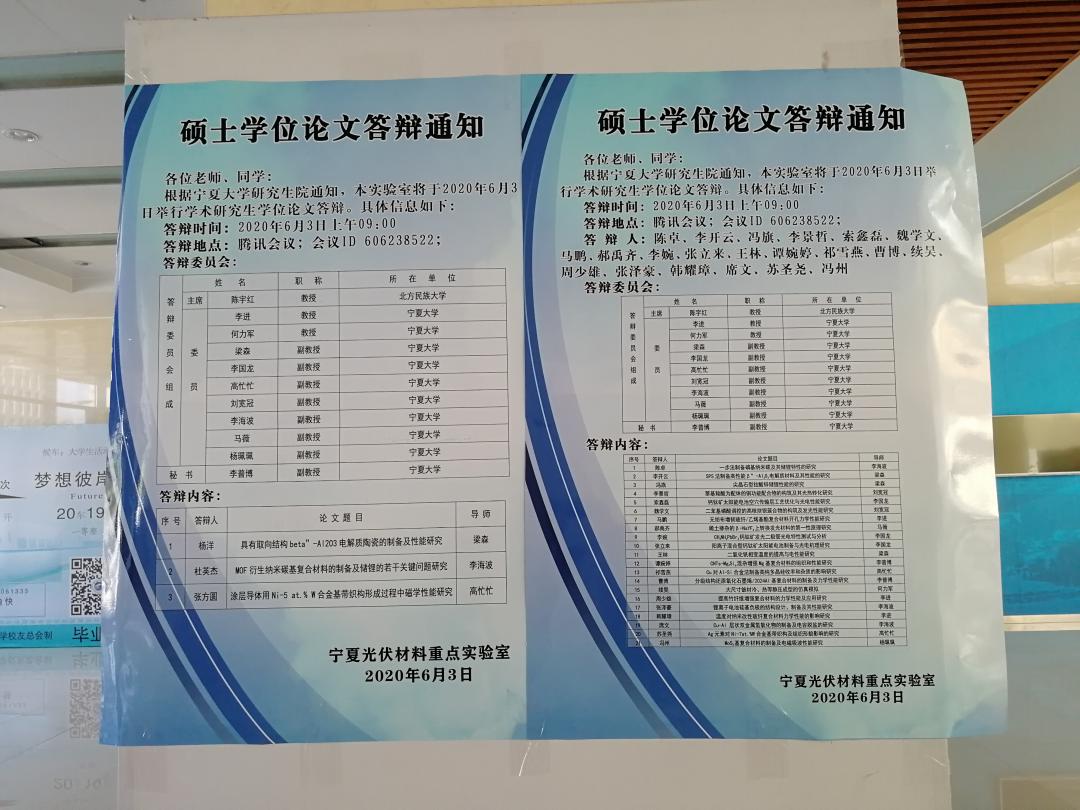 进入新冠疫情防控常态化阶段以来,宁夏光伏材料重点实验室严格遵守和落实公司有关文件会议精神和要求,一方面做好疫情防控工作,一方面有序推进教学科研工作的开展。2020年6月3日,2020届首次硕士研究生学位论文答辩工作在网上进行,分散在全国十几个省区共24名同学参加了答辩。答辩委员会成员参会地点在2026世界杯官网贺兰山校区科技楼,委员会主席由北方民族大学陈宇红教授担任。部分非毕业同学也通过远程视频的方式在线旁听了本次答辩会。