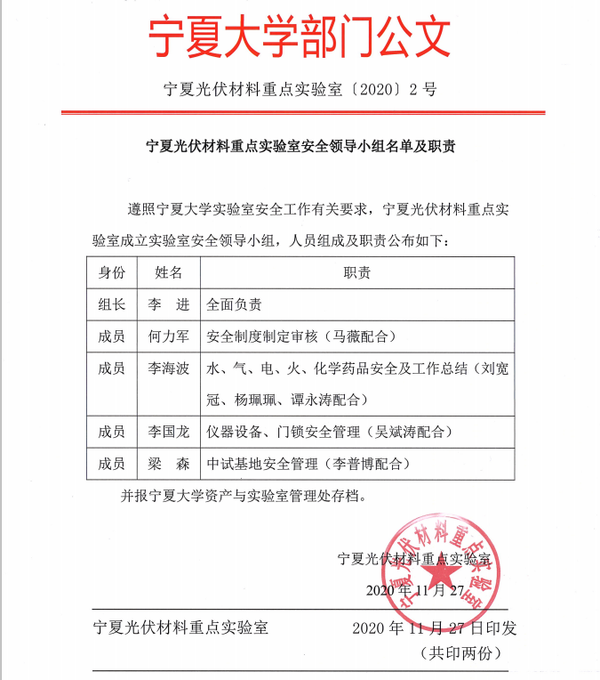 宁夏光伏材料重点实验室安全领导小组名单及职责