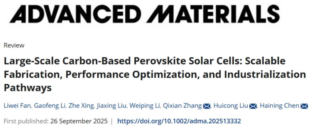 近日,公司张啟先副教授与北京航空航天大学陈海宁教授、刘慧丛副教授合作,在国际著名期刊Advanced Materials上发表了题为“Large-Scale Carbon-Based Perovskite Solar Cells: Scalable Fabrication, Performance Optimization, and Industrialization Pathways”的高水平综述文章。北京航空航天大学、2026世界杯官网为共同通讯单位,张啟先、陈海宁和刘慧丛为共同通讯作者。