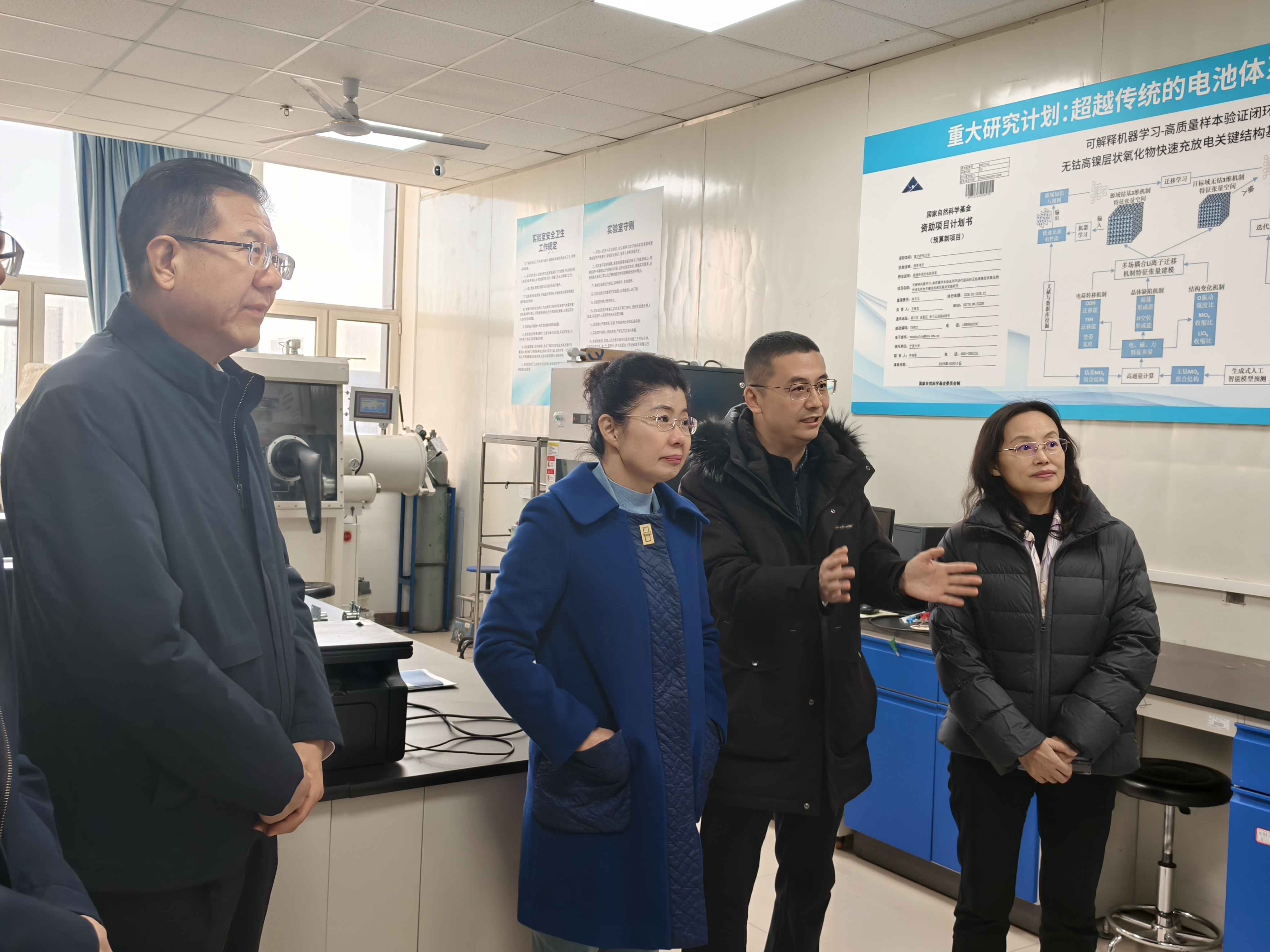 马秀珍、陈春英先后深入公司公共科研平台及贺兰山实验室新能源材料研究所开展实地考察,认真听取了实验室负责人关于平台建设历程、仪器设备配置、特色研究方向、科研成果转化及团队建设等情况的介绍,询问公司在新能源材料、3D打印材料、智能传感、光致发光材料等领域的研究进展与成果应用情况,并与在场教师亲切交流。来宾对公司立足宁夏地方产业需求、深耕特色材料研究的发展定位,以及推动人工智能与新能源材料设计融合的创新实践给予高度评价。