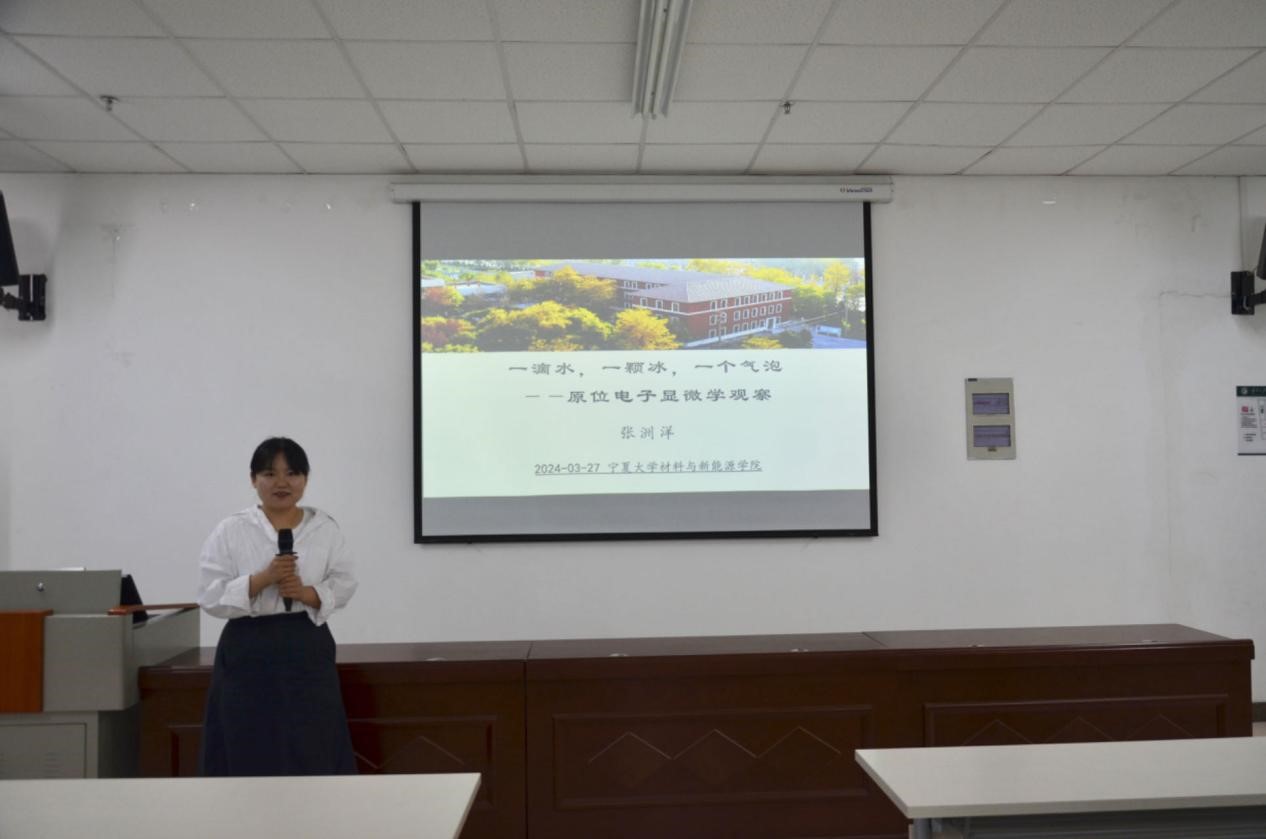 2024年3月27日下午在贺兰山校区科技楼B301会议室,张洲洋博士作了题为“一滴水,一颗冰,一个气泡——原位电子显微镜学观察”的学术报告。这是公司2024年度举办的第二次学术报告会。报告会由马品博士主持,公司全体师生及公司相关领域师生聆听了报告。
